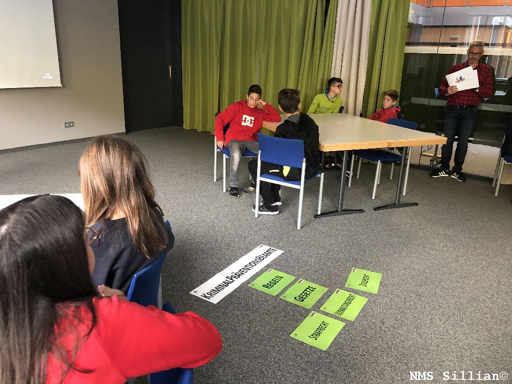 Zwei Kriminalbeamte der Polizeiinspektion Lienz vermittelten zunächst kurz die Grundlagen des österreichischen Rechtssystems und erarbeiteten wesentliche Begriffe, wie beispielsweise Strafmündigkeit, bedingte Strafe oder Notwehr anhand von Fallbeispielen. In einer weiteren Unterrichtseinheit stand der Zusammenhang zwischen Alter und Recht im Mittelpunkt. Wer darf wie lange ausgehen? In welchem Alter dürfen Jugendliche Alkohol konsumieren? Gibt es für den Zugang zum Internet eine Altersbegrenzung? Es zeigte sich, dass das Wissen der Schülerinnen und Schüler zu dieser Thematik teilweise noch große Lücken aufweist.