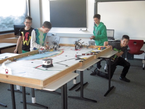 Für den Wettbewerbstisch werden Fahrzeuge gebaut. Mit Ihnen werden durch entspechende Programmierung Objekte auf dem Übungstisch gesammelt und an einen vorgegebenen Ort zurückgebracht.