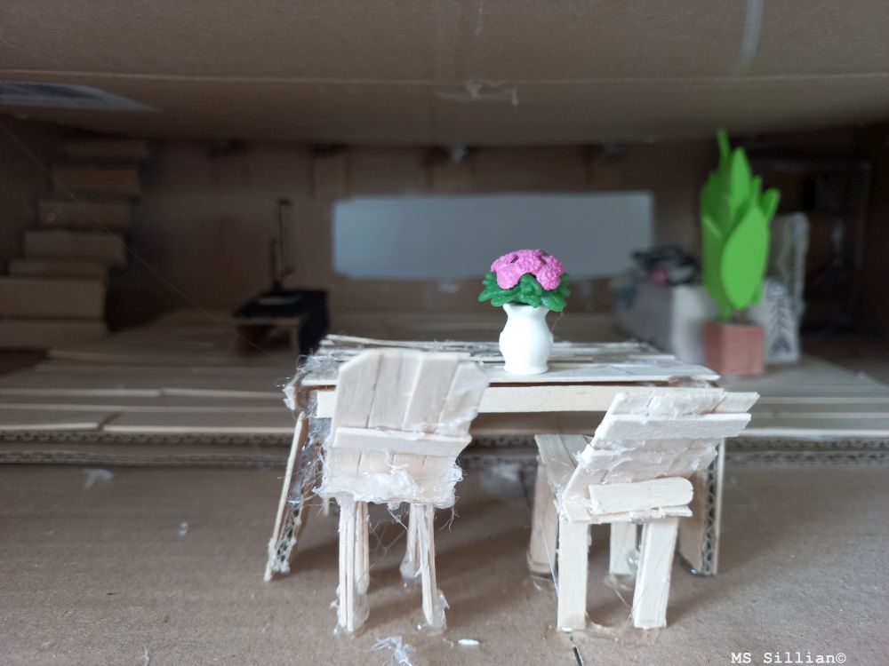 Mit viel Begeisterung und Kreativität machten sich die Schüler:innen ans Werk. Sie schnitten Kartons zurecht, bauten Wände, Fenster und Türen und gestalteten die Innenräume. Einige bastelten Möbel aus den verschiedensten Materialien.